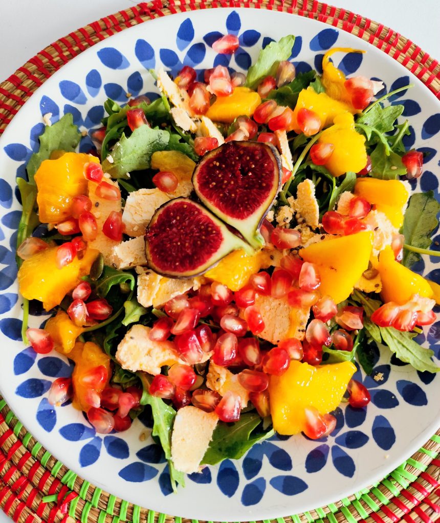 Pues ya está. Ahora lo único que tenemos que hacer es cortar la fruta en trocitos, pelar la granada, mezclarlo todo con la rúcula y poner el queso un poco desmigajado.