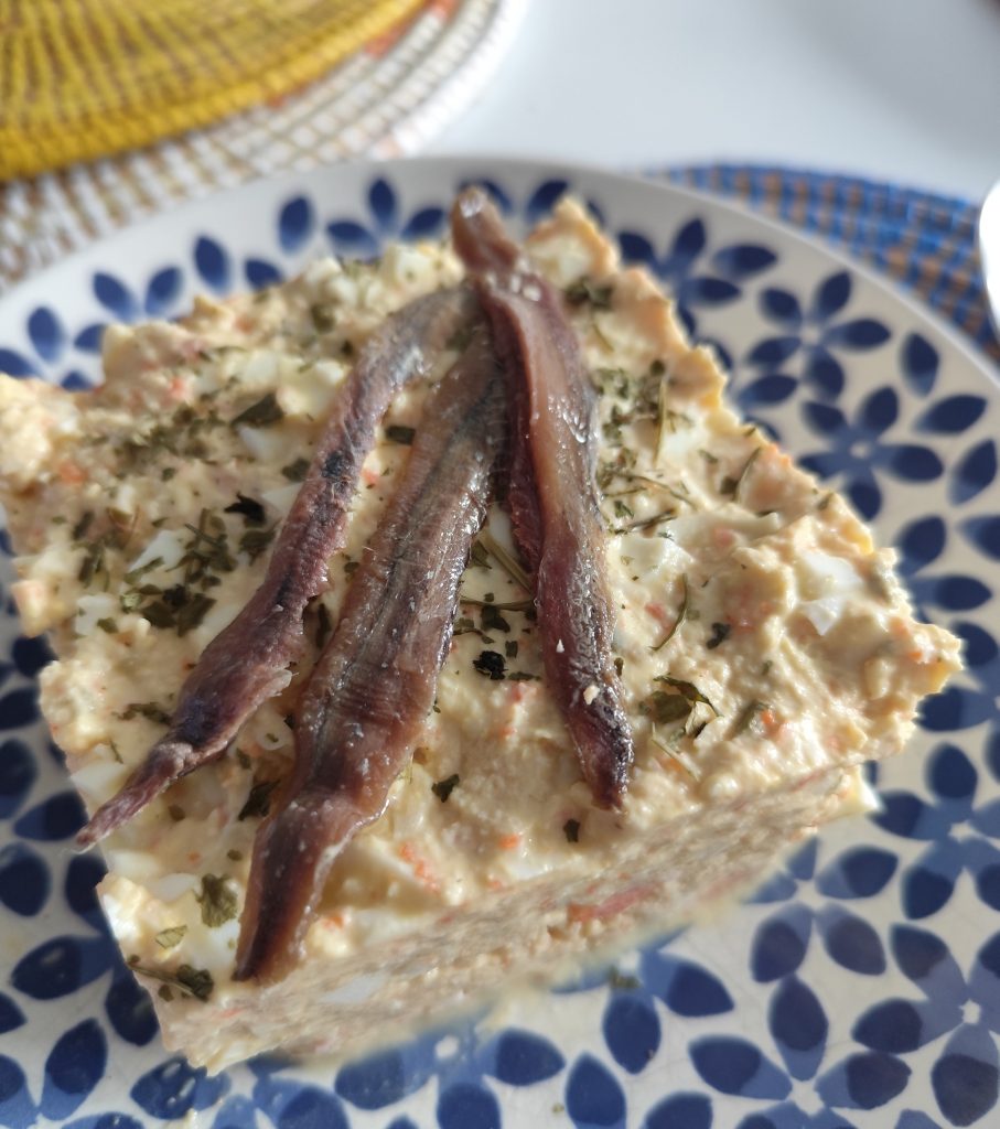 Ponemos todo en un molde cuadrado y lo llevamos a la nevera. Antes de servir quitamos el cuadrado con cuidado y adornamos con una tira de pimiento y un par de anchoas. También podéis poner una aceitunas y unas gambas, cada uno según sus preferencias.