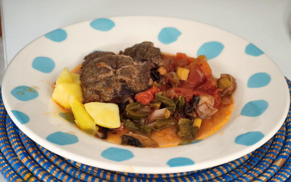 Ponemos todo junto en la olla y añadimos medio litro de caldo de verduras. Lo ponemos en la olla exprés durante unos 50 minutos. Esta cocción viene genial a las carrilleras porque quedan muy muy jugosas.