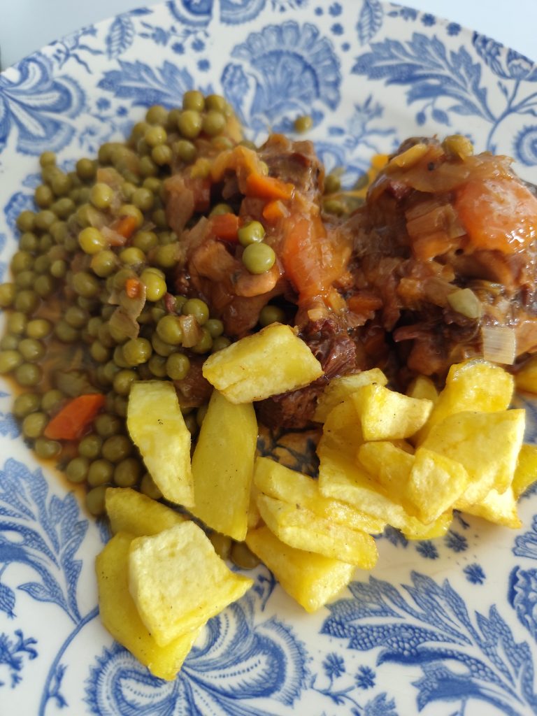 Para que no se nos deshagan los guisantes, los pasamos tres minutos y los ponemos en el plato como guarnición. Añadimos también usa patatas fritas para dar un poco de alegría.